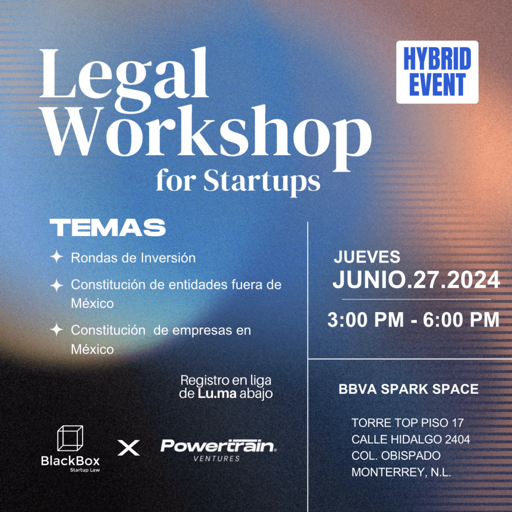 Únete a nuestro próximo Legal Workshop, organizado por Powertrain Ventures en colaboración con BlackBox Startup Law. El evento se llevará a cabo en BBVA Spark Space. Obtén información valiosa sobre temas legales cruciales para tu negocio: